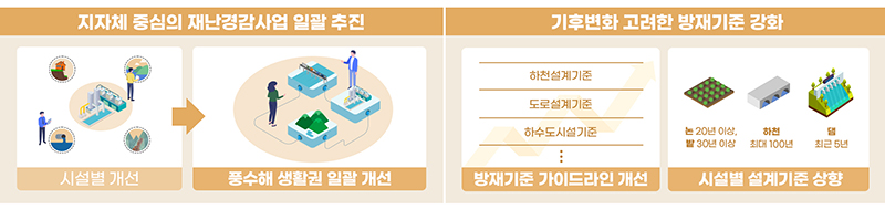 부처별로 추진하던 재해예방사업을 지자체 중심(마을 단위)의 일괄 정비사업으로 개선하고, 기후변화를 고려해 하천과 하수도 등의 방재설계기준을 강화하도록 방재기준 가이드라인을 개선한다.