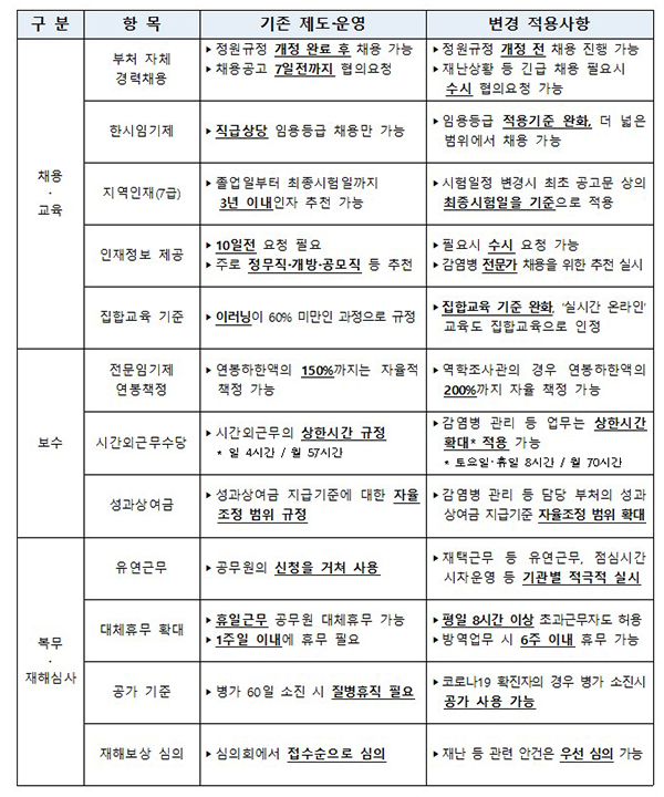 인사처는 이번 지침을 다른 예규·지침보다 우선적용해 감염병 등 위기가 종식될 때까지 한시적으로 시행할 예정으로, 채용, 전보, 보수, 복무 등 각 인사 분야에 17개 항목으로 구성되어 있다.