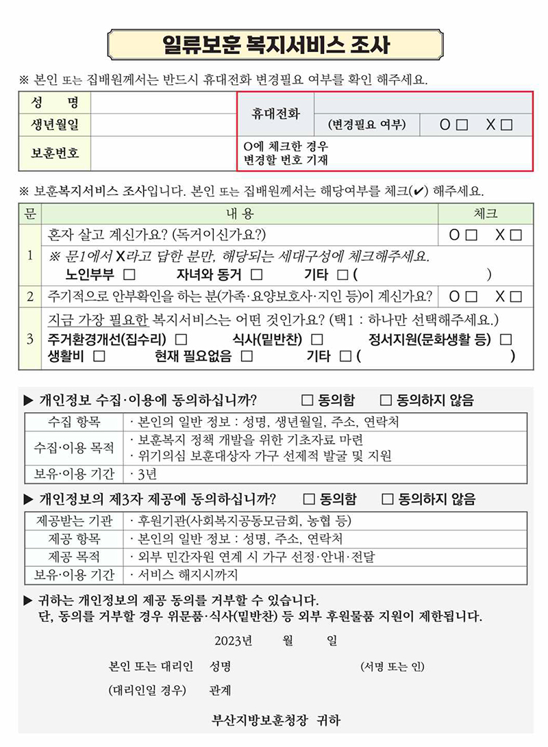 ‘일류보훈 복지우편서비스’는 우선 보훈부에서 위기 의심 보훈대상자로 선정한 국가유공자에게 복지서비스 조사서를 발송하는 것으로 시작된다.