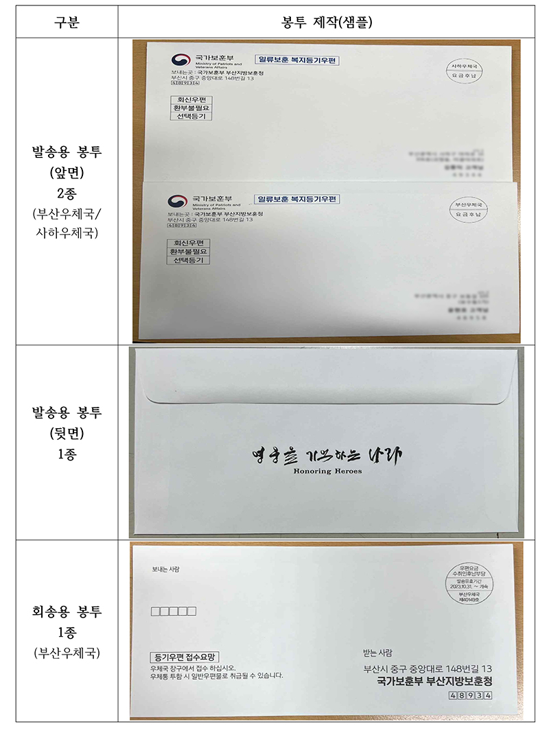 보훈부는 이를 위해 지난 10월 17일 우정사업본부와 ‘일류보훈 복지우편서비스’ 도입을 위한 업무협약, 부산지방청-부산·사하우체국 간 맞춤형 계약등기 발송계약 체결, 복지 사각지대 위기의심가구 명단 추출 방법 개선, 복지우편 발송 대상자 선정, 우편물 내용품 제작 등 서비스 도입을 위한 체계를 마련해 왔다.