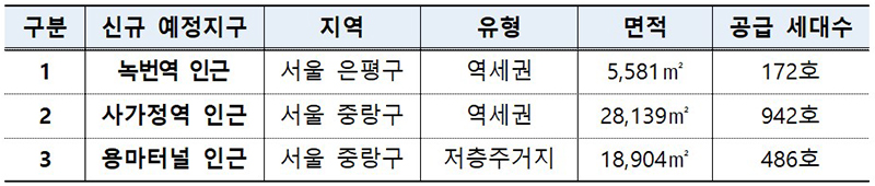국토교통부는 서울 녹번역, 사가정역, 용마터널 등 3곳 1600호를 도심 공공주택 복합지구로 신규 지정한다고 밝혔다.