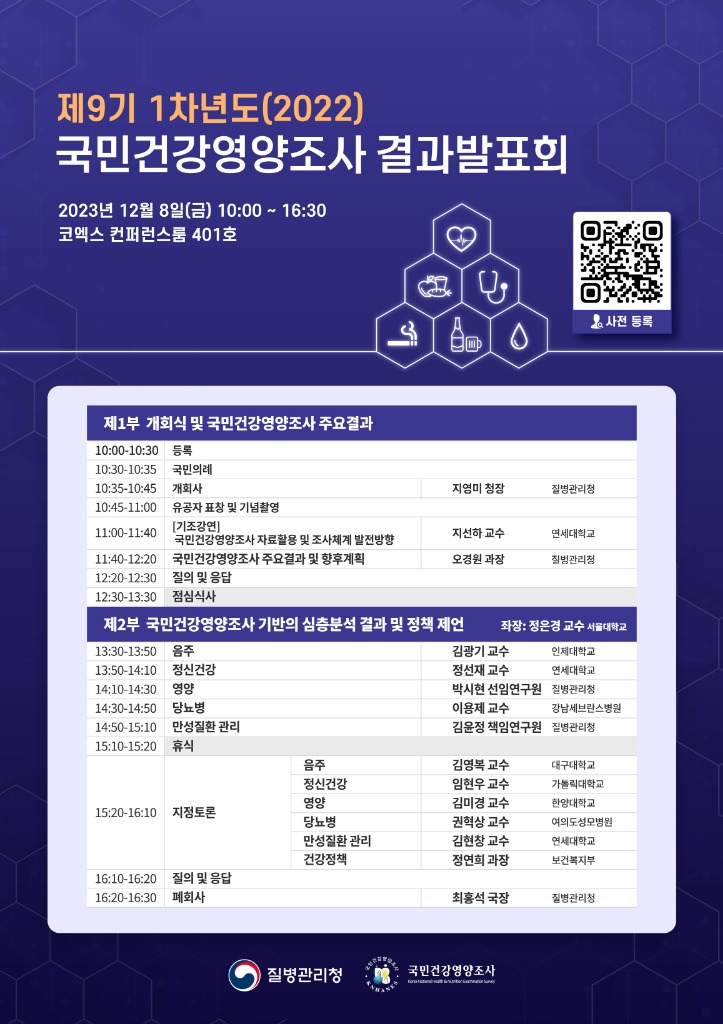 질병관리청은 8일 국민건강영양조사 제9기 1차연도(2022) 결과발표회를 열어 우리 국민의 주요 만성질환 유병 및 건강행태에 관한 통계를 발표했다.