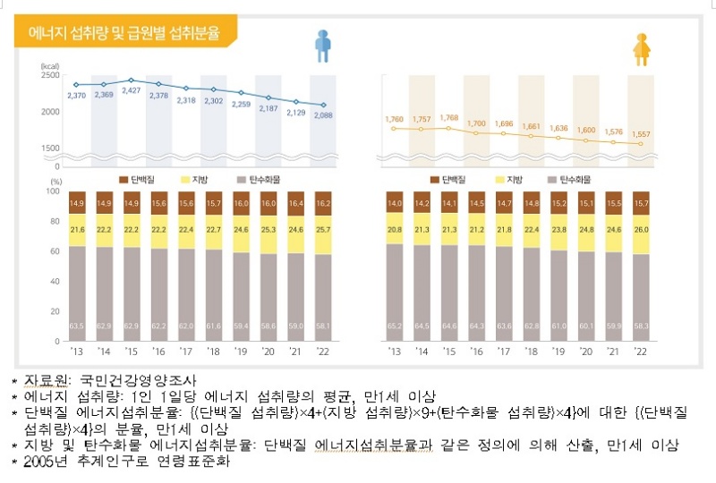에너지 섭취량은 전년과 유사한 수준이었고, 지방을 통한 에너지 섭취 분율은 남 1.1%p, 여 1.4%p 증가한 반면, 탄수화물을 통한 에너지 섭취 분율은 남 0.9%p, 여 1.6%p 감소했다.
