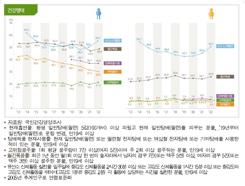 최근 10년 동안 건강행태 변화를 살펴보면, 남녀 모두 음주와 신체활동은 개선되지 않았다. 특히 남자 40대와 여자 30대의 경우 현재흡연율은 줄었으나 여전히 전 연령대 중 가장 높았으며, 고위험음주율과 우울장애 유병률은 증가하고 신체활동 실천율은 감소해 건강행태가 모두 악화된 것으로 나타났다.