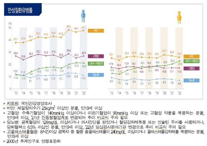 성인(19세 이상)의 비만, 고혈압, 고콜레스테롤혈증 유병률은 지난 2021년 대비 소폭 증가했다. 비만 유병률은 지난해 남자 47.7%, 여자 25.7%로 전년 대비 남자는 1.4%p 늘었고 남자 30~50대 절반이 비만이었으며, 여자는 1.2%p 줄었으나, 20대에서는 18.2%로 2.3%p 증가했다.