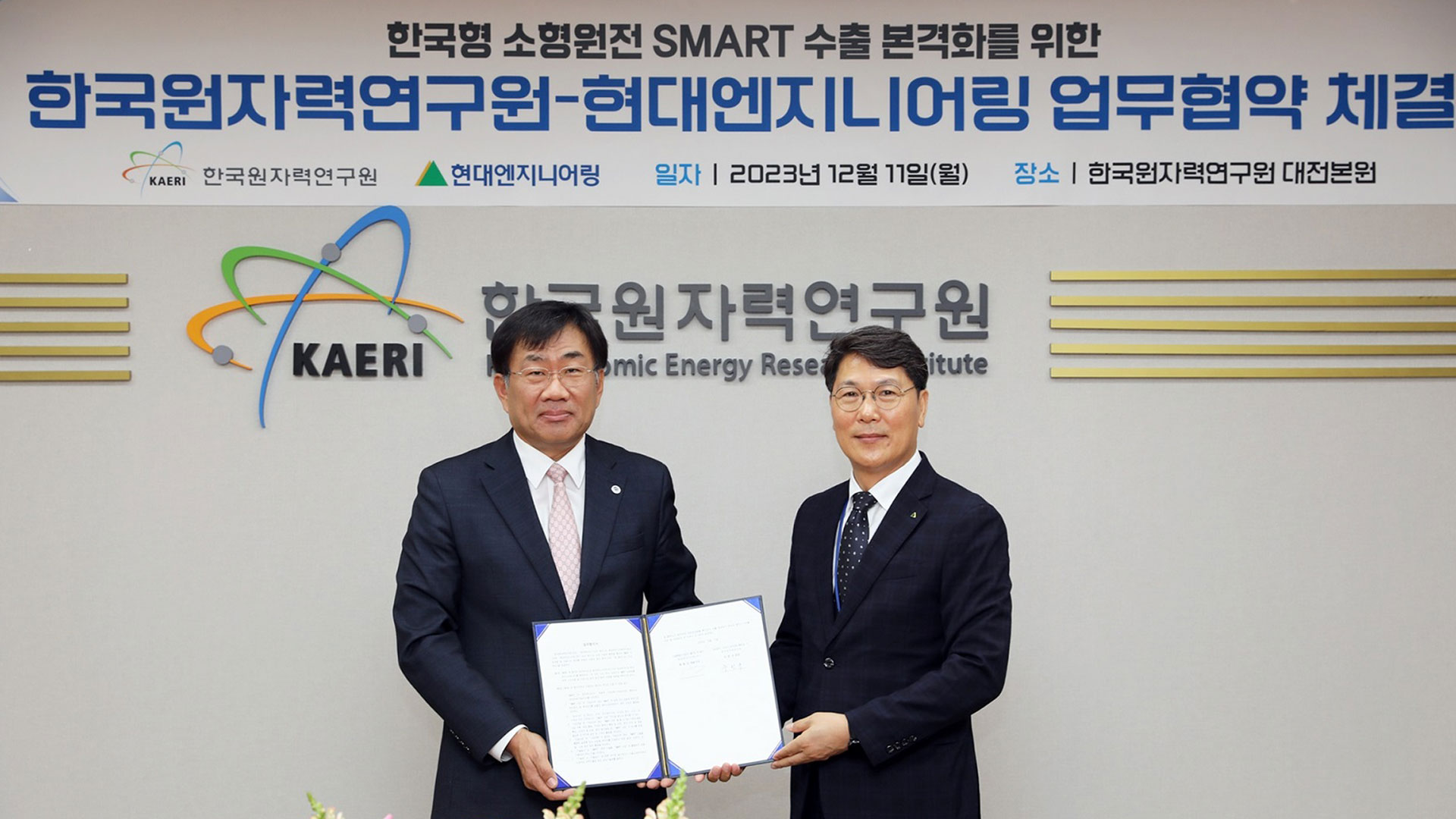 이날 대전광역시 유성구 한국원자력연구원 본원에서 진행된 체결식에는 홍현성 현대엔지니어링 대표이사와 주한규 한국원자력연구원장 등 관계자가 참석해 향후 사업 진행방향 등에 관한 논의 후 업무 협약을 맺었다.