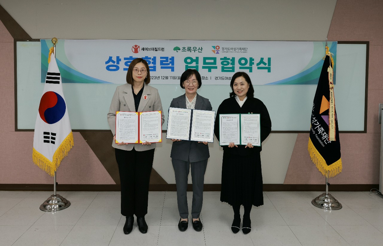경기도여성가족재단은 11일 재단 회의실에서 세이브더칠드런(총장 정태영)과 초록우산(회장 황영기) 2개 기관과 아동권리 증진 및 돌봄서비스 전문성 강화 마련을 위해 상호 간 교류 협력체계를 구축하고 각종 사업과 연구 등 아동 및 양육자 삶의 질 향상을 도모하고자 업무협약을 체결했다.
