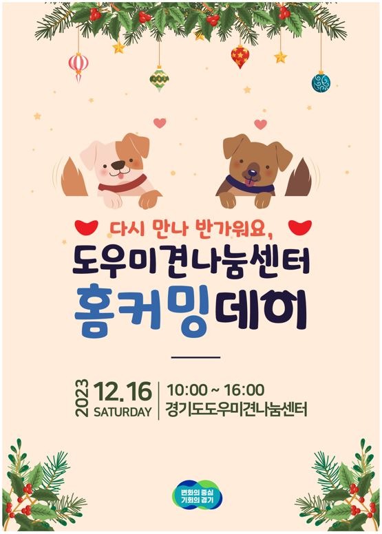 경기도가 12월 16일 도우미견나눔센터(화성시 마도공단로1길 181-15)에서 반려동물 입양문화 활성화 및 도우미견나눔센터 개관 10주년 기념 ‘다시 만나 반가워요, 도우미견나눔센터 홈커밍데이’를 개최한다.