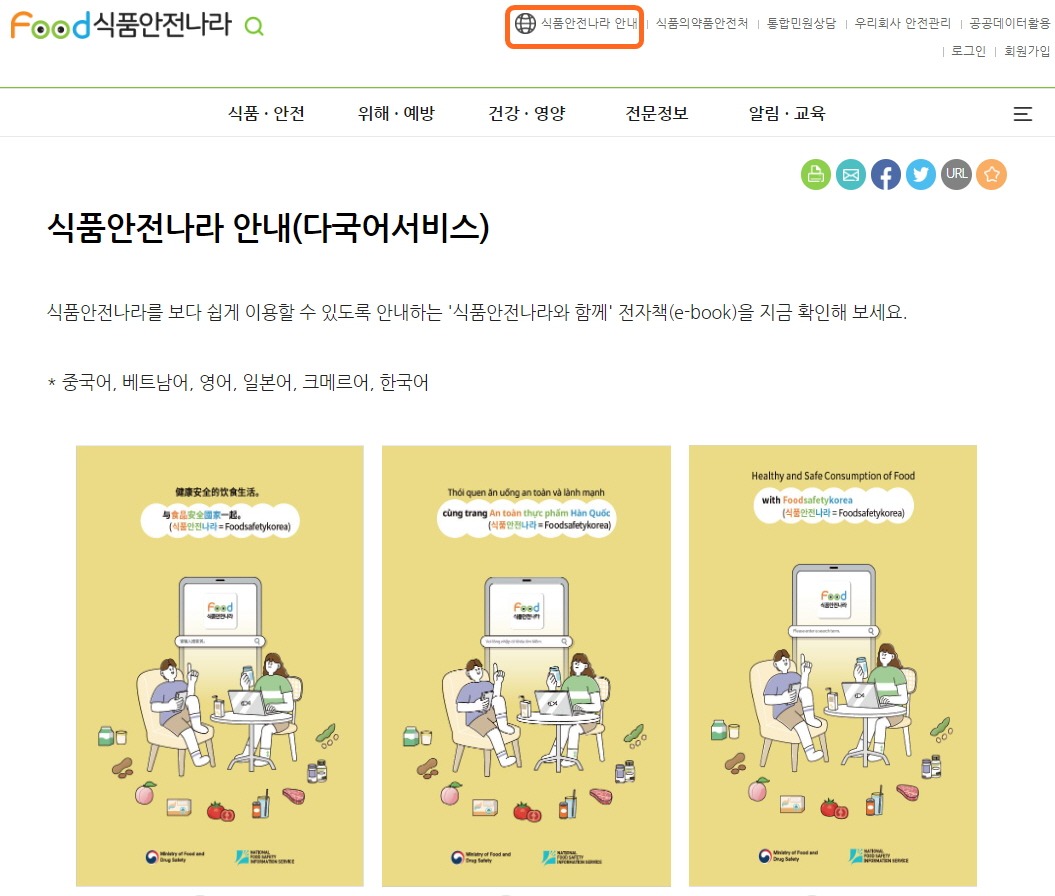 이번 전자책은 국내 거주하고 있는 외국인 등에게 식중독 예방하기, 회수·판매중지 식품 확인하기, 식품 알레르기 예방하기 등 일상생활에서 필요한 정보를 제공하기 위해 중국어, 베트남어, 영어, 일본어, 캄보디아어로 제작했다.