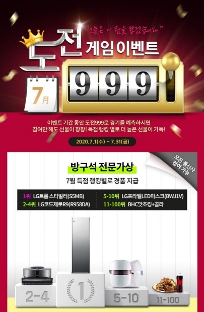 'U+프로야구'는 7월 한 달간 '도전999 게임 이벤트'를 진행한다. '도전999'는 경기득점 예측 게임으로, U+프로야구 앱 '게임' 탭에서 이용할 수 있다. 경기가 있는 날 3개 팀을 선택하면 각각 100·10·1의 자리 슬롯에 순서대로 배치되고, 실제 경기득점 1의 자리 숫자 3개가 모여 세 자리 숫자가 완성된다. 숫자가 높은 순서대로 LG 트롬 스타일러(1명), LG 코드제로R9(3명), LG프라엘 LED 마스크(6명), BHC 치킨 교환권(90명)을 제공하며, 당첨자 발표는 8월 10일(월)이다.
