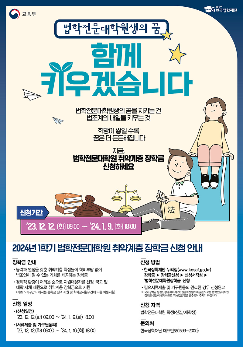 신청 기간은 12일 오전 9시부터 내년 1월 9일 오후 6시까지다. 신청 대상은 법전원 신입생(입학예정자) 및 재학생으로, 재단 누리집( https://www.kosaf.go.kr )에서 24시간 신청이 가능하다.