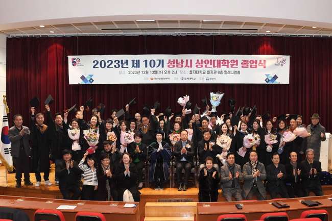 성남시가 13 일 을지대학교 을지관 8 층 밀레니엄 홀에서 ‘2023 년 성남시 상인대학원 졸업식 ’ 을 개최했다.