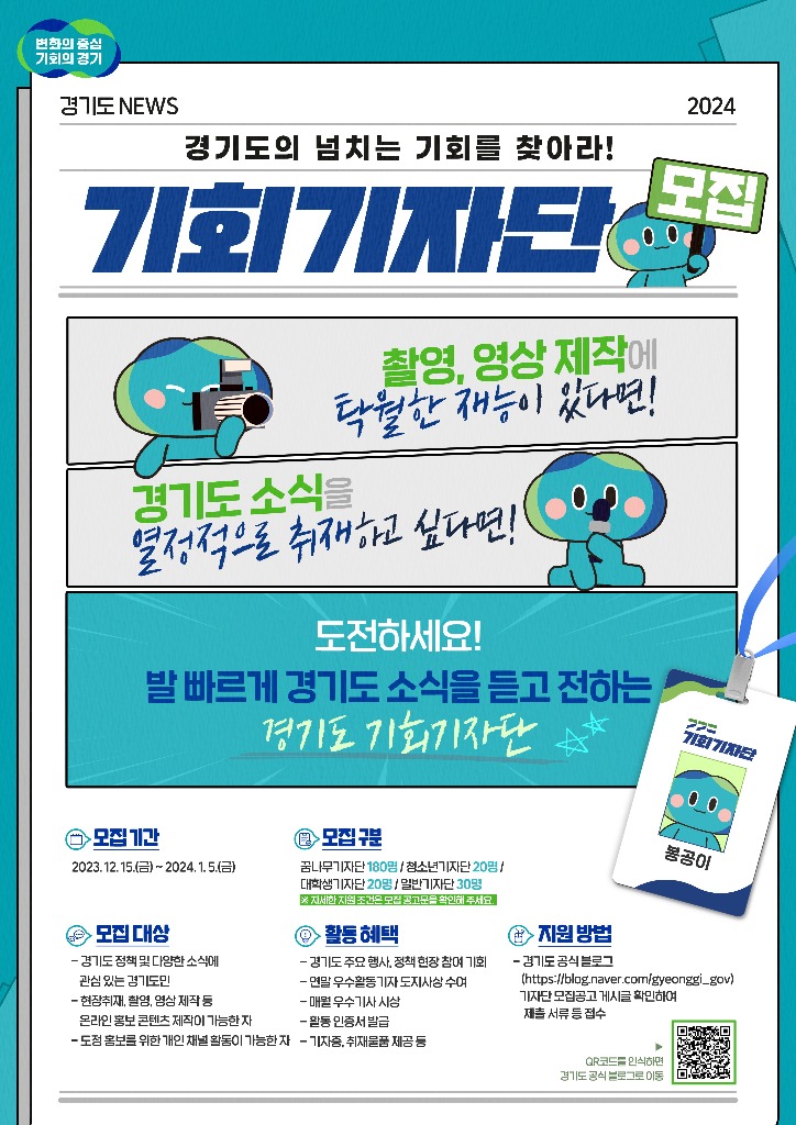 경기도는 초등학생부터 청소년, 대학생, 일반인까지 도정 가치와 주요 정책, 다양한 지역 소식을 취재하고 기사로 전하는 ‘2024 경기도 기회기자단’을 12월 15일부터 2024년 1월 5일까지 모집한다.