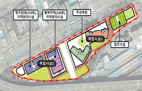 기존 쪽방촌을 철거하고 쪽방촌 일대 약 1만㎡에 쪽방주민을 위한 영구임대주택 370호, 젊은 층을 위한 행복주택 220호, 분양주택 600호 등 총 1200호를 공급한다.