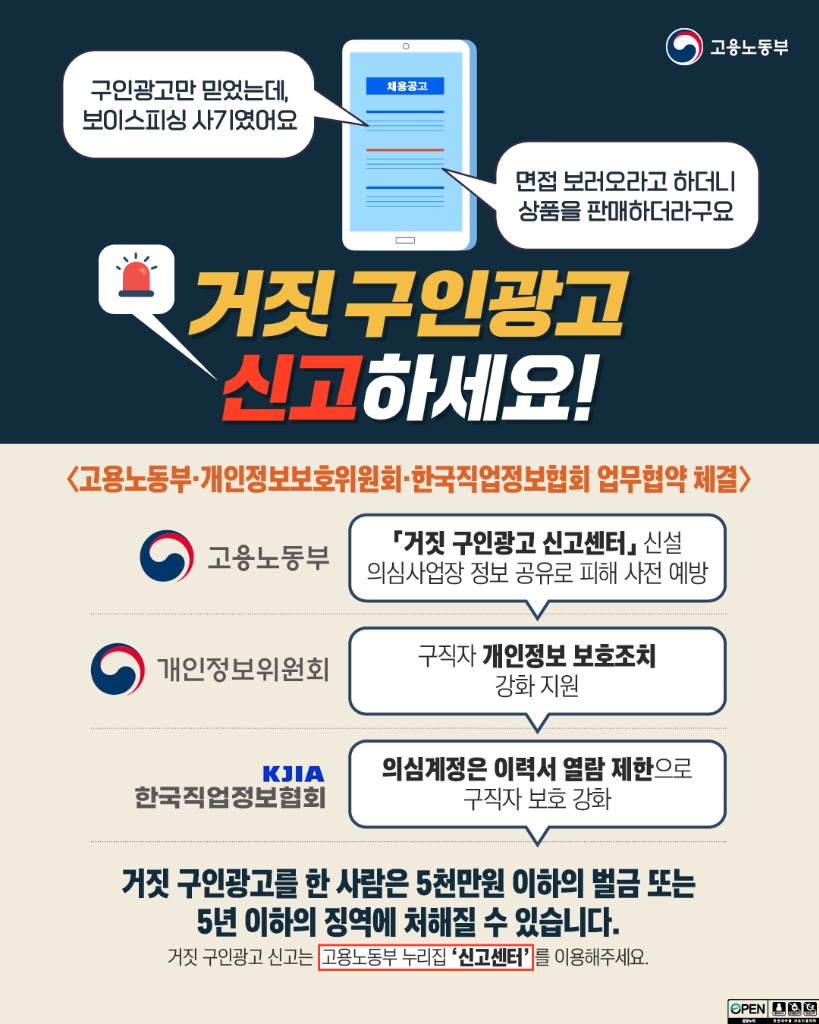업무협약에는 고용노동부는 ▲‘거짓 구인광고 신고센터*(온라인)’를 신설하여 구직자 신고에 대해 즉시 조사·수사 의뢰하고 ▲법 위반 의심 사업장 정보를 민간에 공유하여 계정 정지·가입 제한 등 조치를 할 수 있도록 하여 거짓·허위 구인 광고에 대한 신속한 대응 및 예방체계를 구축하며