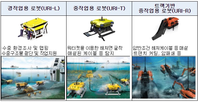 해양수산부와 한국해양과학기술원은 수중건설로봇 제작 기술의 국산화를 위해 2013년부터 ‘해양개발용 수중건설로봇 개발사업’을 추진하여 2018년에 수중건설로봇 3종을 개발하였다. 이후 2019년 5월 민간기업에 기술을 이전하고, 성능 개선과 현장 실적 확보를 위해 ‘수중건설로봇 실증 및 확산 사업(‘19~’22)’을 추진하여 국내외 건설시장 진출을 위한 시장 경쟁력 확보에도 박차를 가하고 있다.