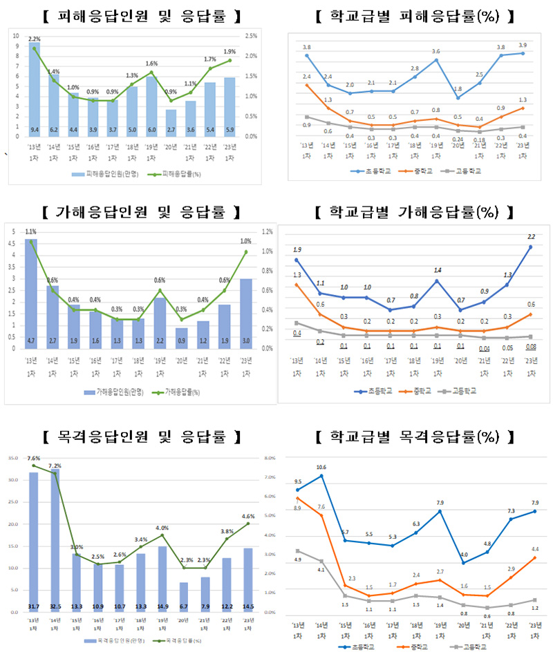 학교폭력 목격응답률은 4.6%로 0.8%p 늘었고 학교급별로는 초등학교 7.9%, 중학교 4.4%, 고등학교 1.2%로 조사돼 각각 0.6%p, 1.5%p, 0.4%p 증가한 것으로 확인됐다.