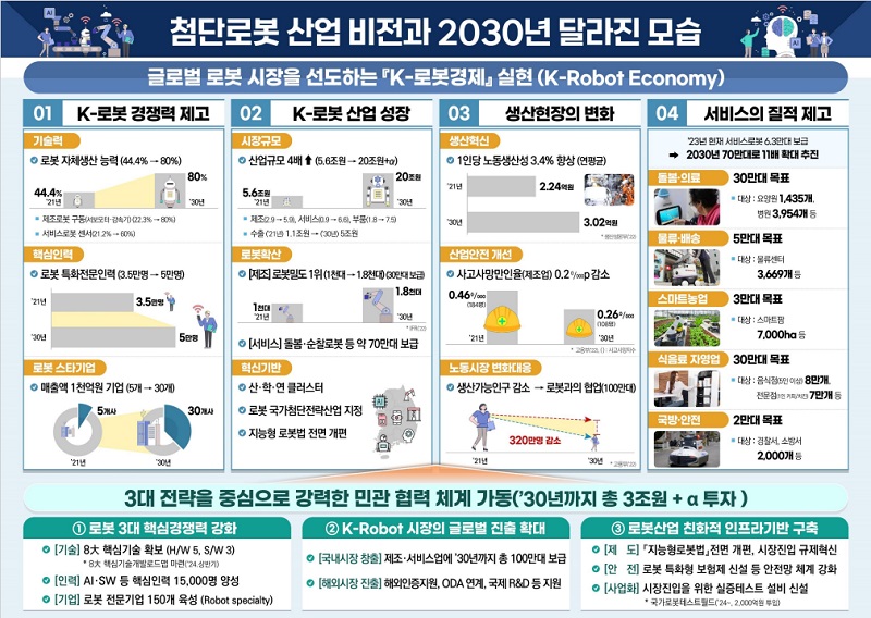 정부는 새로운 성장 동력인 K-로봇경제에 2030년까지 민관합동으로 3조 원 이상을 투자해 감속기, 자율조작 등 8대 핵심기술을 확보하고, 매출 1000억 원 이상 지능형 로봇 전문기업도 30개 이상 육성하기로 했다.
