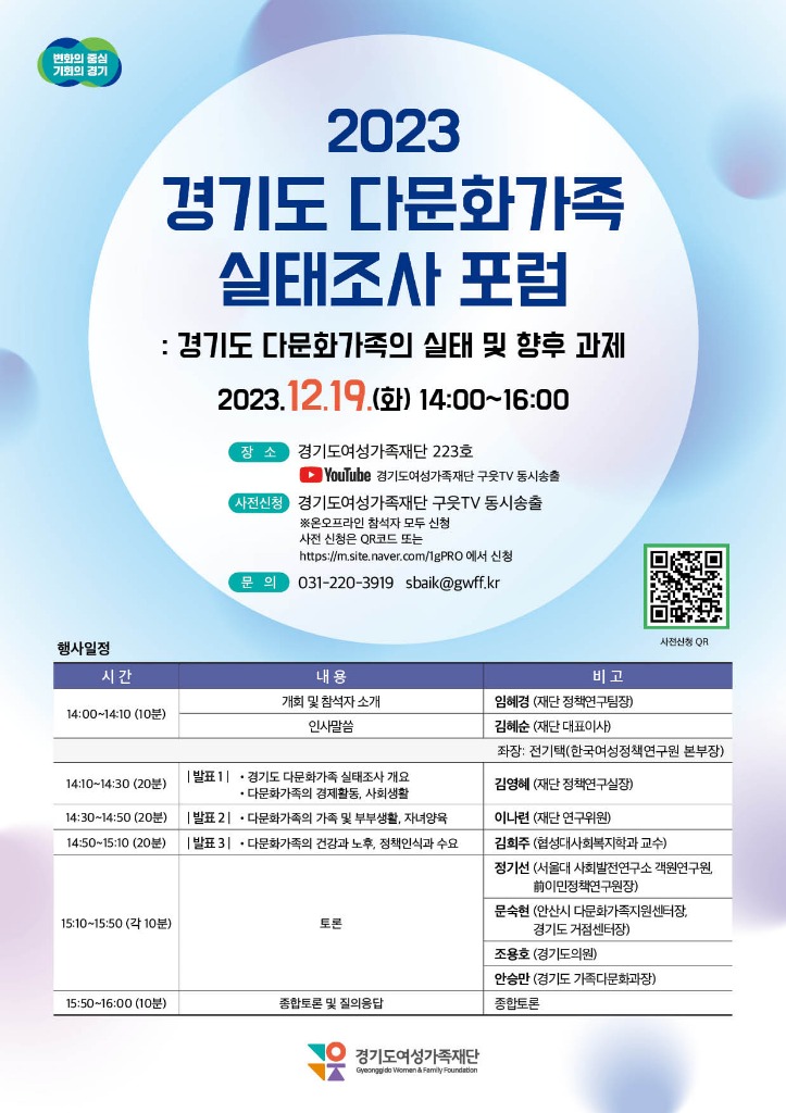 경기도여성가족재단은 19일 오후 2시 재단 회의실에서 ‘경기도 다문화가족 실태조사’ 관련 정책포럼을 개최한다.