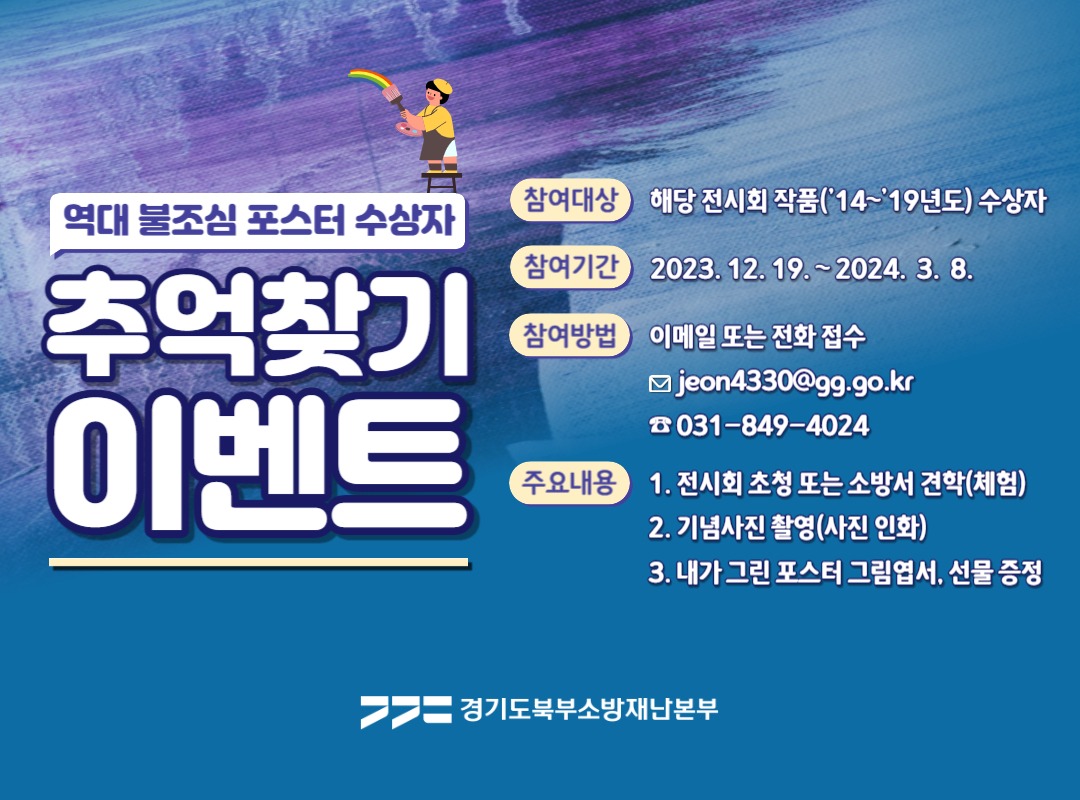 전시 중인 2014~2019년 역대 우수작품의 주인공을 찾아 안전문화 추억을 상기시키고, 이를 계기로 안전의식을 일깨우기 위한 ‘추억찾기’ 이벤트도 진행한다. 이벤트 참여는 해당 전시작품의 주인공이 경기도북부소방재난본부 담당자 이메일([email protected]) 또는 전화(☎031-849-4024)로 신청하면 된다.