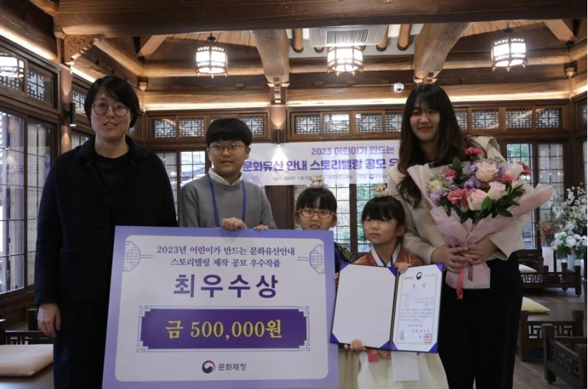 문화재청은 지난 15일 한국의 집(서울 중구)에서 우리 문화유산의 가치를 어린이들이 직접 영상으로 제작해 소개하는 <어린이가 만드는 문화유산 안내 스토리텔링> 공모전에서 선정된 최우수상 1점과 우수상 1점에 대한 시상식을 개최했다.