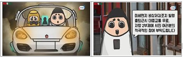 먼저 이번에 금상을 수상한 행안부의 ‘안전한TV’의 미세먼지 영상툰은 방독면 없이는 생활할 수 없는 미래의 상황을 가정해 악몽같은 미래가 오지 않도록 미세먼지에 관심을 갖고 일상에서 개개인의 적극적인 참여가 필요함을 애니메이션으로 표현했다.