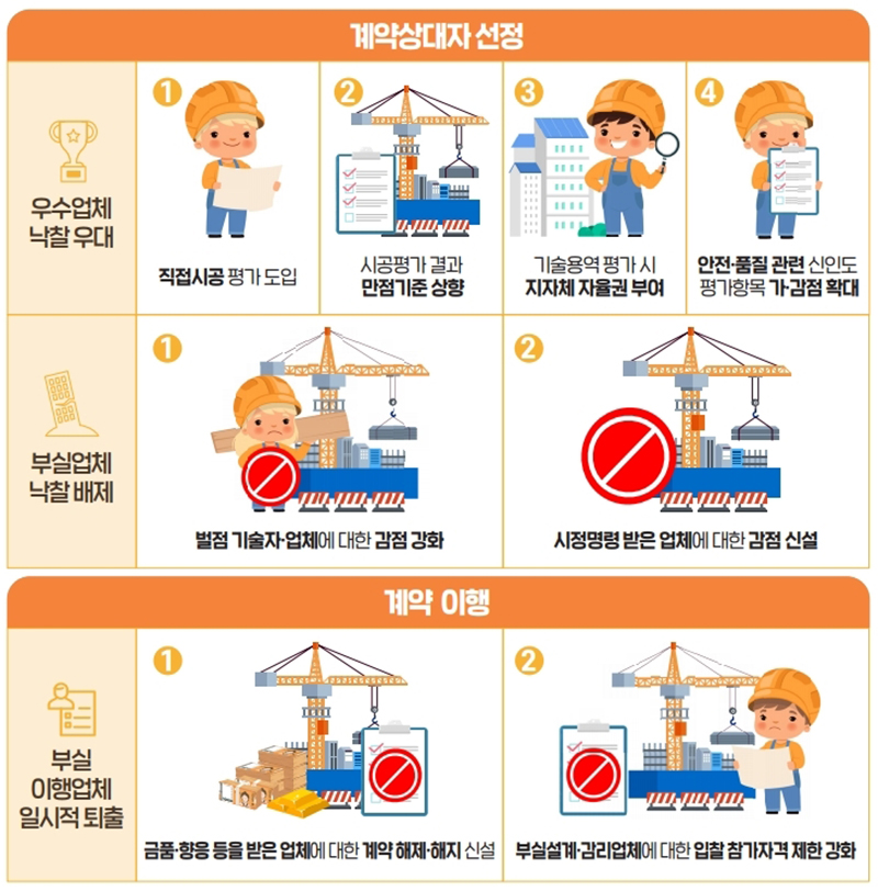 시공 과정에서 금품·향응을 받은 업체의 제재도 강화되는데, 계약이행과 관련된 제3자로부터 금품·향응 등을 제공받은 경우 지자체는 해당 업체와의 계약을 해지할 수 있다.