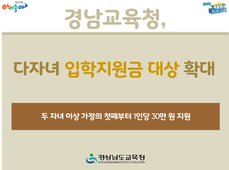 경남교육청은 세 자녀 이상 양육하는 가정의 셋째 자녀부터 입학준비물품 구입비를 지원해오다 지난달 ‘두 자녀 이상을 양육하는 가정의 첫째부터’로 관련 조례를 개정했다. 두 자녀 이상 가정의 첫째 자녀까지로 확대한 것은 전국 최초다.