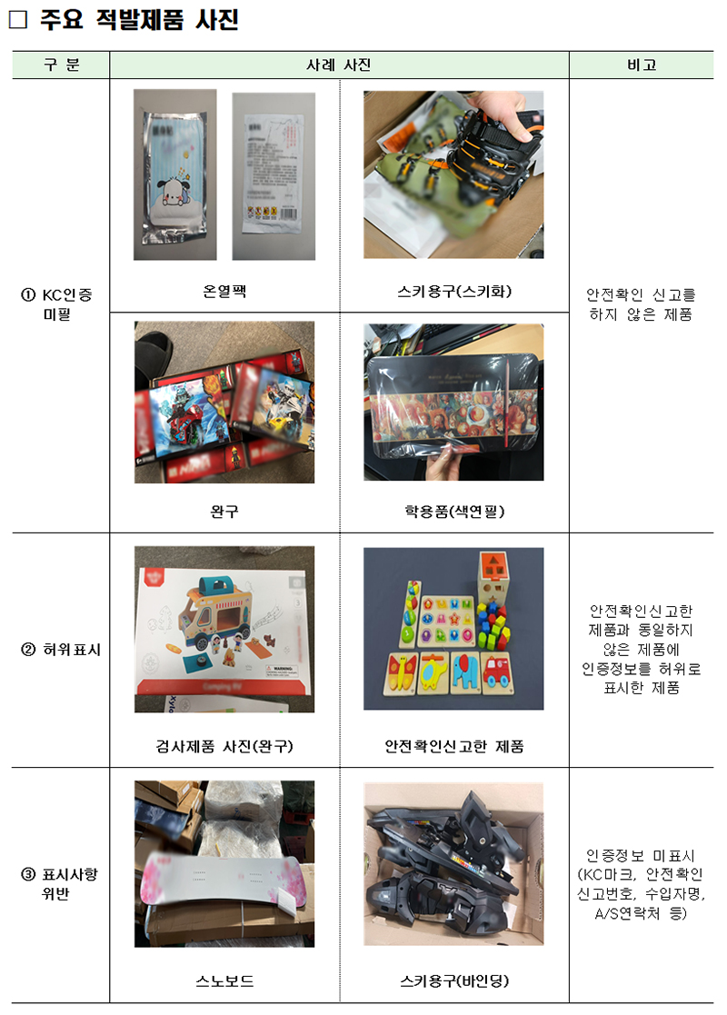 이번에 적발된 품목은 눈썰매, 스노우 튜브, 보드게임 등 완구류가 약 30만 5000개로 가장 많았다. 가스라이터 약 6만 2000개, 기타 어린이 제품 약 4만 2000개가 그 뒤를 이었다.