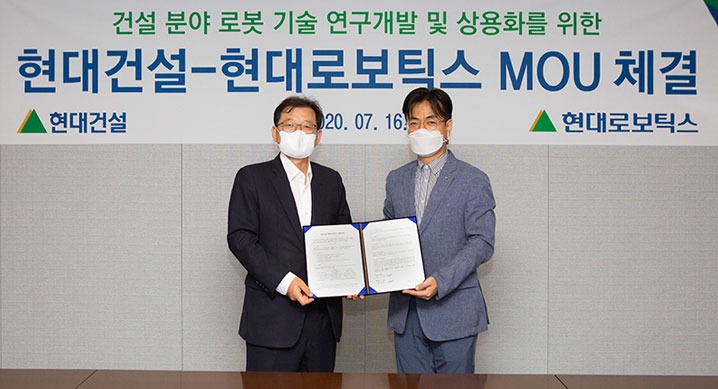 현대건설이 16일 서울 종로구 계동 현대빌딩에서 현대로보틱스와 “건설 로보틱스 분야 연구협력”에 대한 양해각서(MOU)를 체결했다.