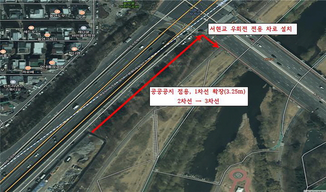 시는 서현교 진입 우회전 차로 확장으로 분당 내곡 간 도시고속화도로에서 유입되는 차량과 수내교 인근 차량을 분산해 교통 상황을 원활하게 할 것으로 내다봤다.