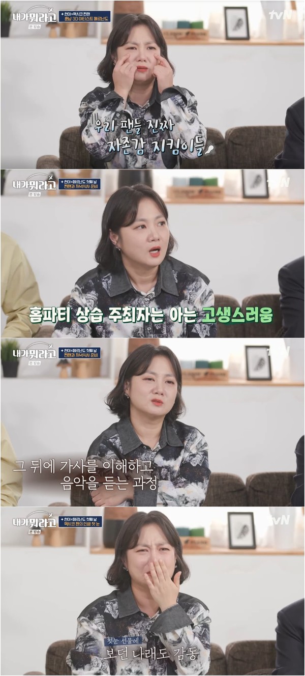 이날 방송에서 박나래는 가수 조현아의 글로벌 팬 페르난도가 조현아를 좋아하게 된 계기를 듣고는 “현아의 노래를 들으며 이겨냈대. 우리 팬들 자존감 지킴이들”이라면서 시작부터 눈물바다를 예고했다.