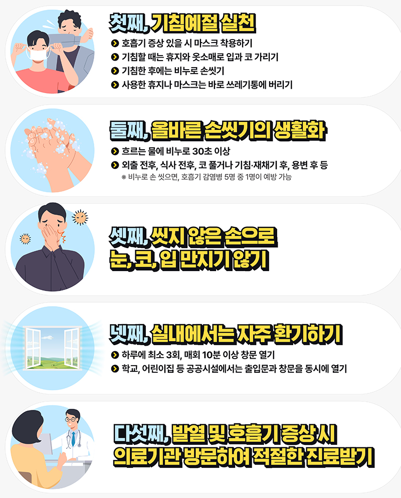 지 청장은 “올바른 손씻기, 기침예절 등 개인 위생수칙을 준수하고 어느 때보다 인플루엔자 예방접종이 더욱 중요하다”면서 “면역력이 떨어지는 어르신, 임신부, 어린이는 감염성 호흡기질환 예방을 위해 예방접종 실시를 적극 권장한다”고 거듭 강조했다.