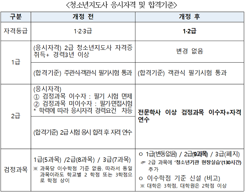 종전 1·2·3급으로 운영하는 청소년지도사 자격등급은 1·2급으로 간소화해 2급은 필기·면접시험을 폐지하고 전문학사 이상 학력소지자가 2급 검정과목(9과목)을 이수한 뒤 자격연수까지 완료하면 자격증을 발급한다.