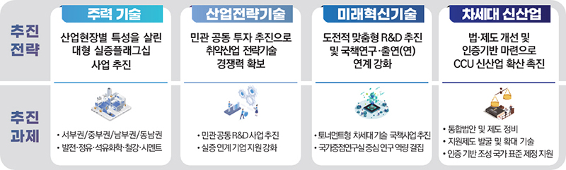 이에 이산화탄소 포집·활용(CCU) 기술 고도화 전략을 추진하고자 주력기술에 대해서는 4대 권역별 CCU 플래그십 프로젝트(예타)를 추진하고, 산업전략기술을 육성하기 위해서는 민·관 공동투자를 지원한다.
