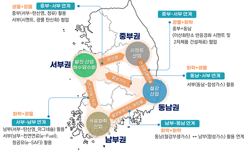 남부권은 지역의 강점인 화학산업과 주로 연계하고, 동남권에서는 기존 철강 산업과 연계하여 제철 과정에서 배출되는 이산화탄소로 메탄올을 생산하거나 슬래그로 대체 건설 소재를 생산한다.