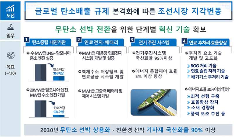 특히 2030년까지 무탄소 선박을 상용화하고 친환경 선박 기자재 국산화율 90% 이상을 달성하는 것을 목표로 하는 기술 개발 전략을 수립했다.