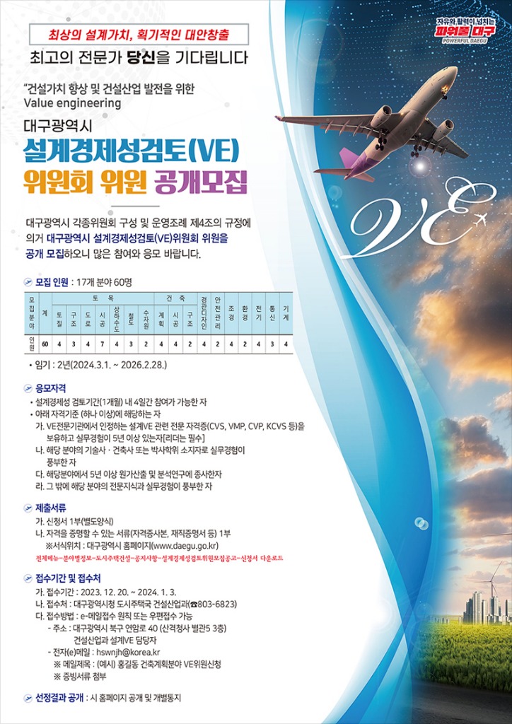 대구광역시는 시, 구·군, 공사·공단에서 시행하는 총공사비 80억 원 이상 공공건설공사의 설계 내용에 대해 새로운 아이디어 개발을 적용하고 불필요한 기능을 삭제해 공사비 절감과 시설물의 성능향상, 구조적 안전 및 품질확보를 위한 건설기술심의위원회 ‘설계경제성검토(VE) 분과위원’을 12월 20일(수)부터 2024년 1월 3일(수)까지 14일간 공개 모집한다.