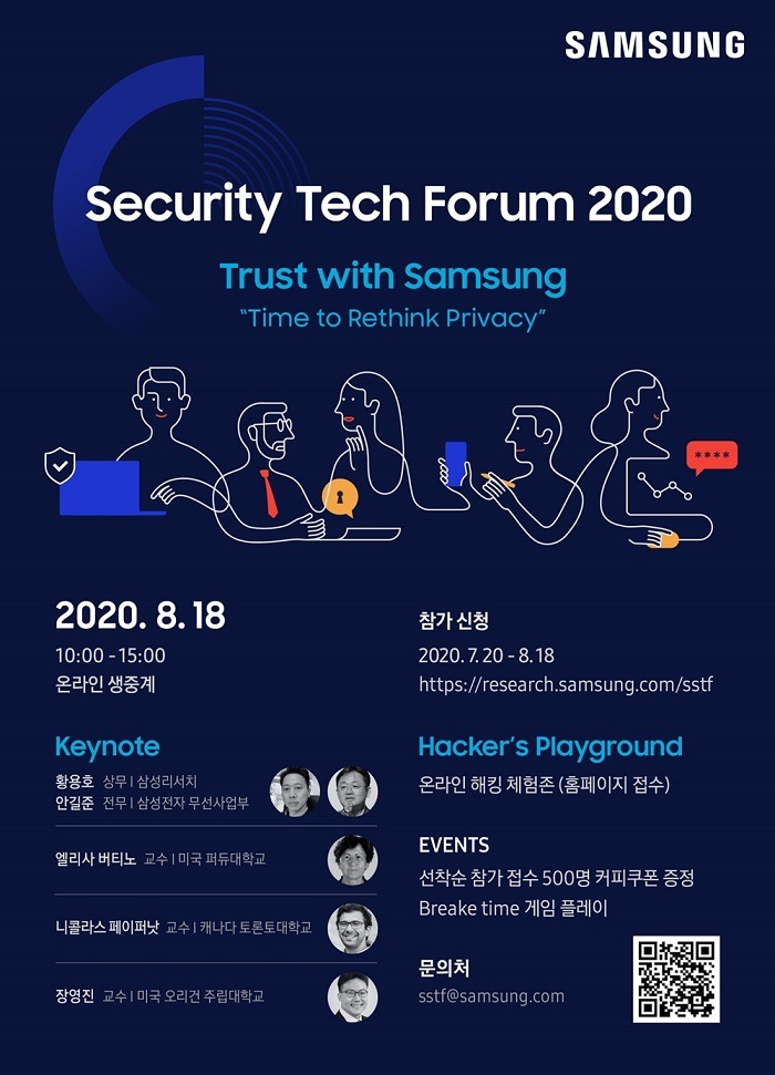 한편, ‘삼성보안기술포럼’에 대한 자세한 내용은 삼성리서치 홈페이지(http://research.samsung.com/sstf)를 통해 확인할 수 있으며 온라인 참가 신청은 7월 20일부터 행사 당일까지 가능하다. 사전 등록자를 위한 이벤트도 진행된다.