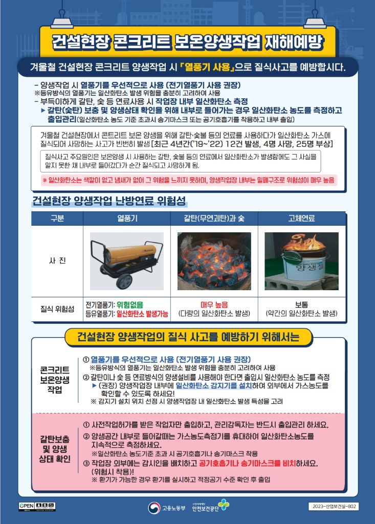 고용노동부는 겨울철 건설현장에서 콘크리트 보온양생 작업 중 질식사고가 자주 발생한다며 각별한 주의를 당부했다.