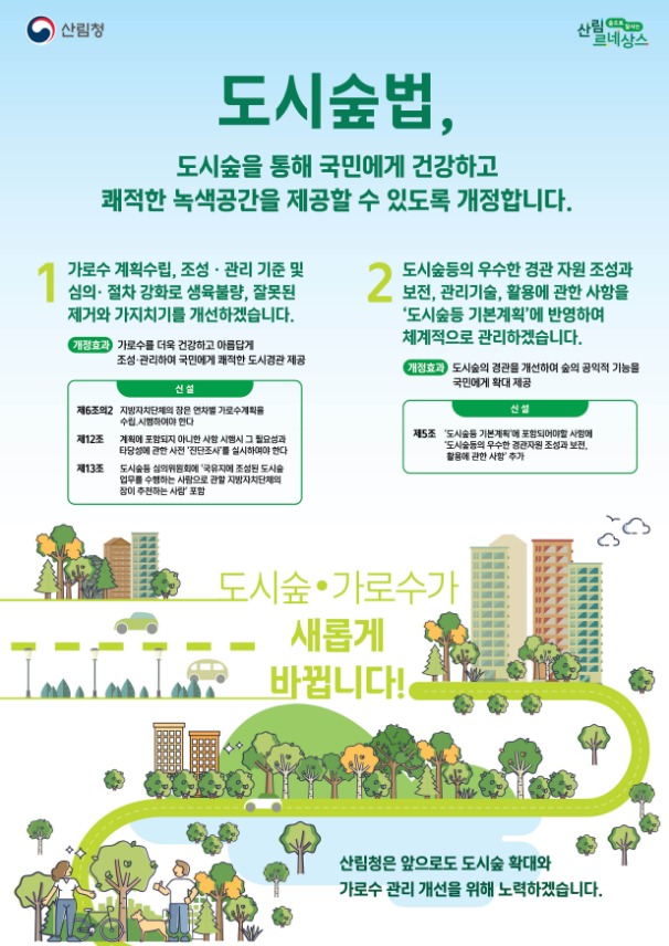그동안 ‘가로수가 간판을 가린다’, ‘건물이나 전선에 닿는다’ 등의 민원과 일부 지자체의 비용 절감 과정에서 과도한 가지치기로 인해 시민의 눈살을 찌푸리게 하는 경우가 있었으나, 이번 「도시숲법」 개정을 계기로 그간 지적되어 온 가로수 관리의 문제점을 개선하면 도시 미관을 살리고 아름다운 가로수를 만들어 갈 수 있을 것으로 기대된다.