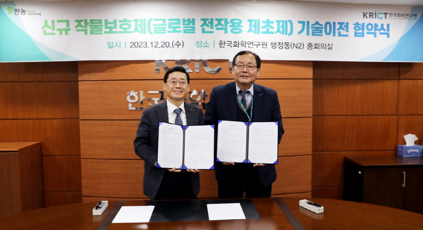 팜한농이 20일 한국화학연구원과 ‘신규 작물보호제 기술 이전 협약’을 체결했다. 대전 한국화학연구원에서 진행된 협약식에는 김무용 팜한농 대표와 이영국 한국화학연구원 원장 등 십여 명이 참석했다.