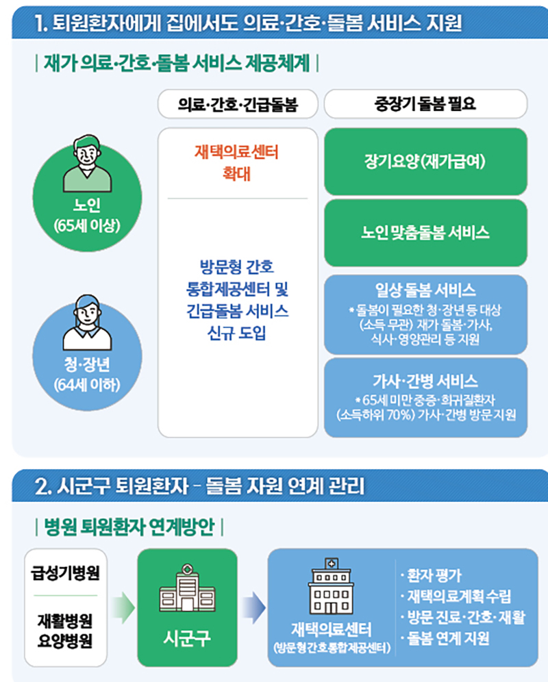 환자가 퇴원 후에도 집에서도 재가 의료·간호·돌봄서비스를 받을 수 있도록 지원한다.