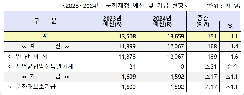 문화재청은 2024년도 예산(기금 포함) 총지출 규모가 국회 심의과정에서 정부안 1조 3,489억 원보다 170억 원(1.3%) 증액된 1조 3,659억 원으로 확정되었다고 밝혔다. 국회 심의과정에서 증액 반영된 주요 사항은 세계유산보존관리 지원(58억 원), 역사문화권 정비(18억 원), 국립조선왕조실록전시관 운영(15억 원), 국가유산 광역 활용기반 구축(6억 원), 국가유산 경관 개선(5억 원), 어린이 무형유산전당 건립(5억 원) 등이다.