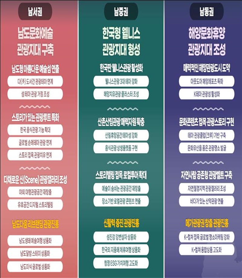 남동권은 해양문화·휴양 관광지대, 남중권은 한국형 웰니스 관광지대, 남서권은 남도문화예술 관광지대로 만드는 전략사업을 추진한다.