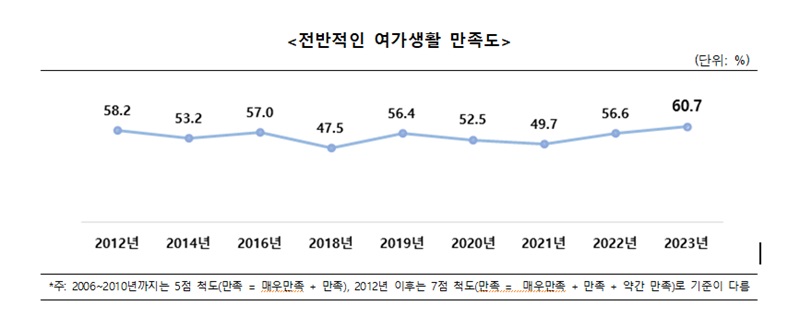 먼저 2023년 국민여가활동조사 결과에 따르면 전반적인 여가 생활에 만족한다는 응답률은 60.7%로 전년 대비 4.1%포인트 증가해 2012년 이후 가장 높은 것으로 집계됐다.