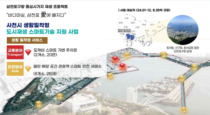 △사천시는 유동인구가 많은 삼천포 용궁수산시장과 전통수산시장 주변에 주차 공간 확보를 위한 스마트 가변 주차장을 구축하고, 재난 사고 위험에 대비하여 방파제 파도 공원 일원을 포함한 해안가 4곳에 스마트 경보 장치와 미디어폴 설치 등을 통한 스마트 안전 체계를 구축한다.