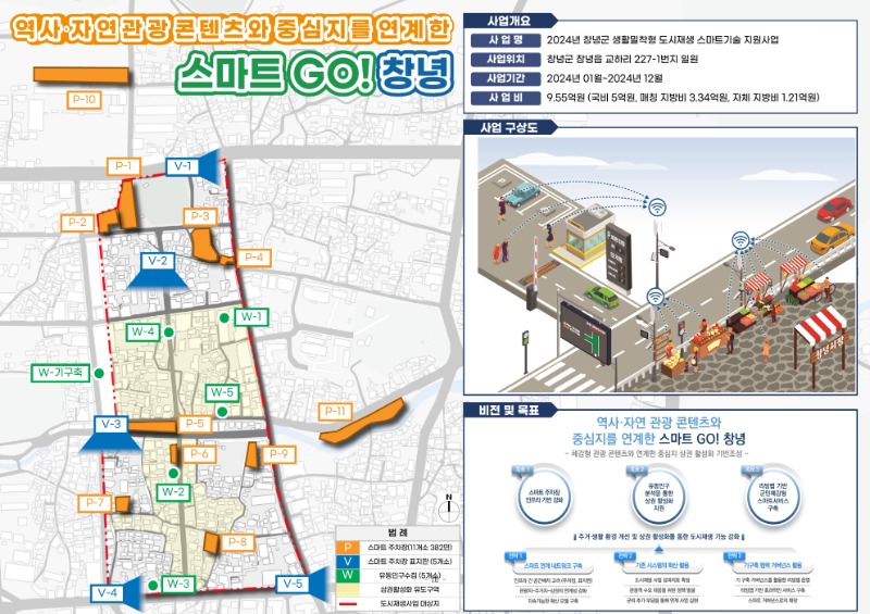 △창녕군은 유네스코 세계유산에 등재되는 교동·송현동 고분군 등 주요 관광지가 인접한 도시재생사업지의 입지적 특징을 반영하여 관광객과 주민들의 주차장 이용 효율성 제고를 위한 스마트 주차장을 구축하고, 관광 정책 및 콘텐츠 발굴 등을 위한 유동 인구 분석 시스템을 도입한다.