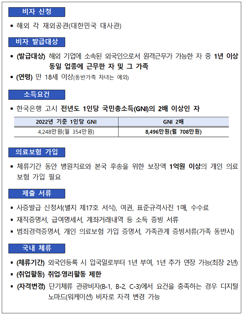 법무부는 이처럼 해외 원격근무자들의 불편을 해소하기 위해 외국 회사에 소속된 근로자가 재직 경력과 일정 이상의 소득을 증명하는 경우에 관광하면서 국내에 장기 체류할 수 있는 디지털 노마드(워케이션) 비자 제도를 마련했다.