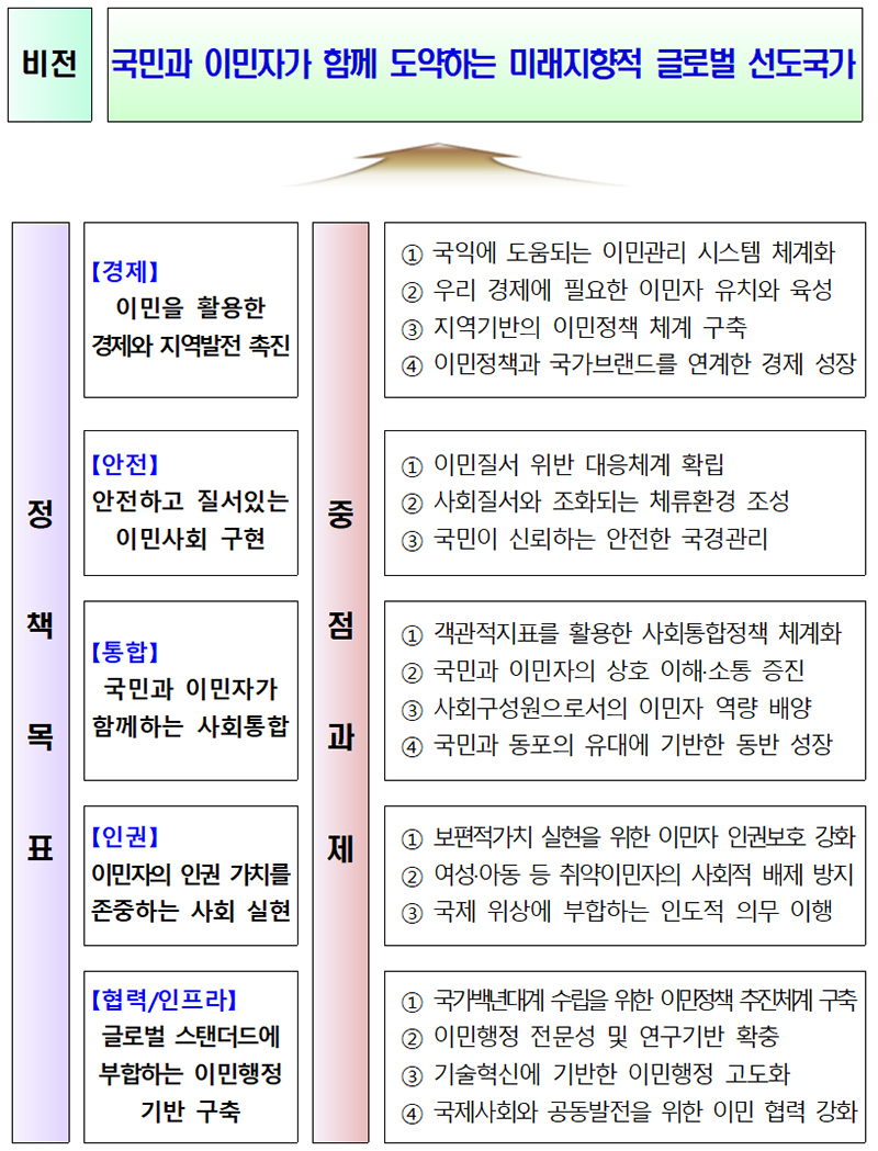 정부는 ‘국민과 이민자가 함께 도약하는 미래지향적 글로벌 선도국가’ 달성을 위해 5년 간의 외국인정책 설계도를 마련했다.